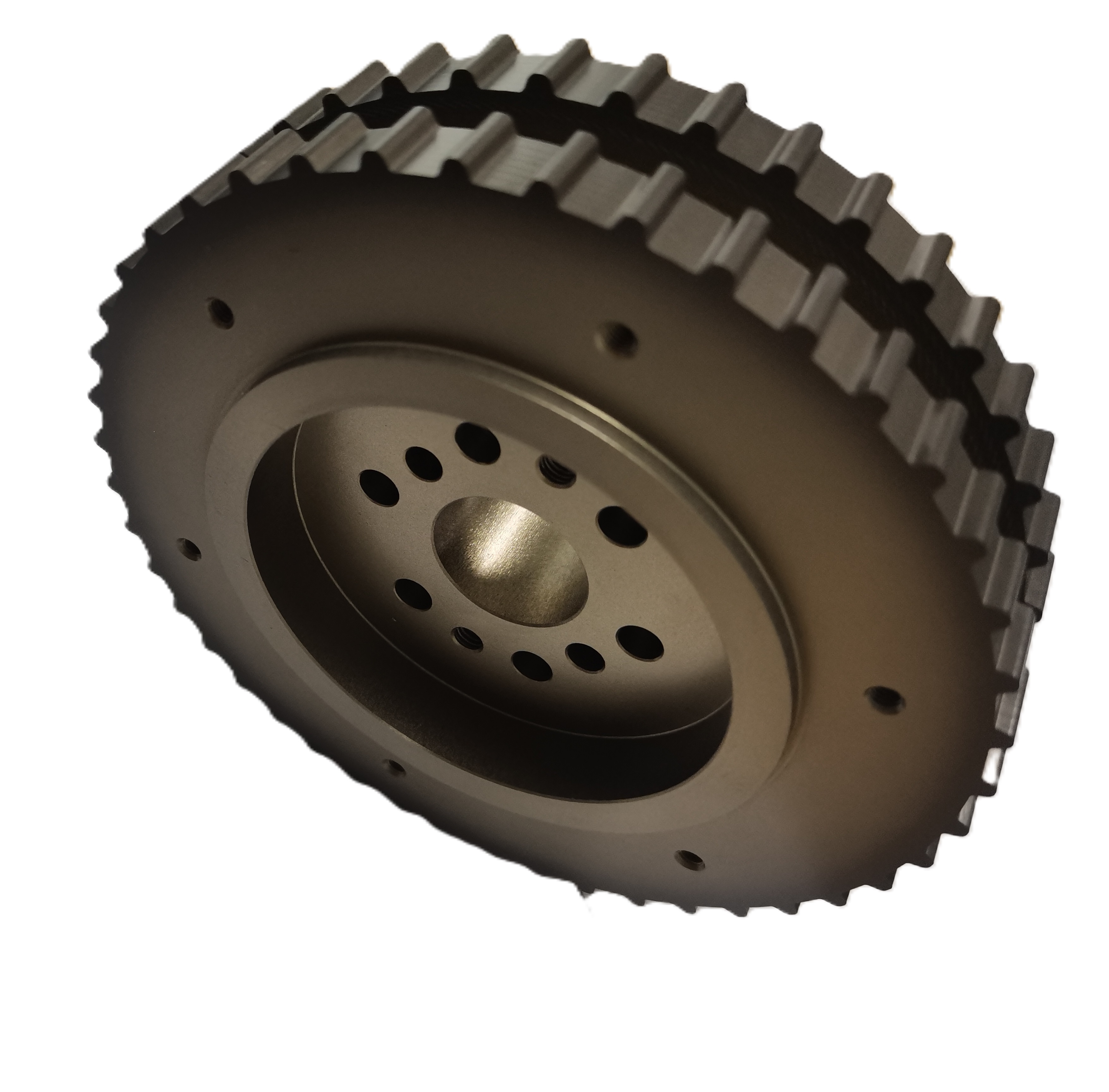 客供来图MALA38AT10300-A-D25-沉槽同步轮。产品介绍:加工减重槽以及固定孔。表面硬质阳极氧化。减重同步轮主要用于有腐蚀环境,防静电绝缘设备,化工业,小型矿机设备等。硬质阳极氧化提高了其硬度和耐磨性,可达250~500千克/平方毫米,良好的耐热性 ,硬质阳极氧化膜熔点高达2320K ,优良的绝缘性 ,耐击穿电压高达2000V ,增强了抗腐蚀性能 ,在=0.03NaCl盐雾中经几千小时不腐蚀。